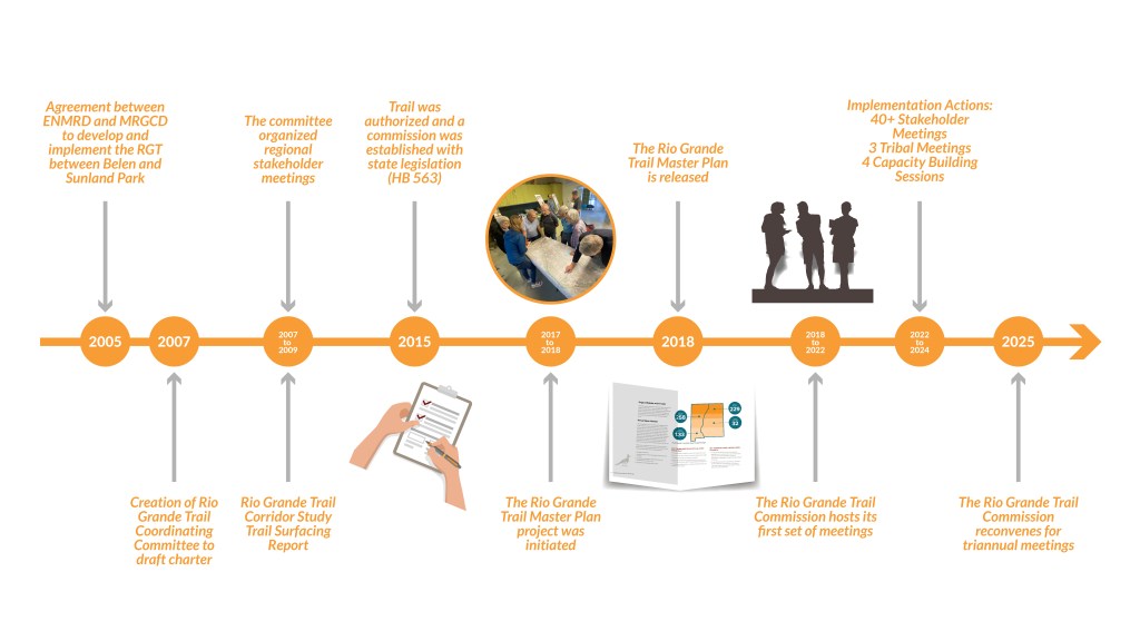 The vision for the trail preceded the various planning efforts. It started taking shape when, in 2005, the Energy Minerals and Natural Resources Department and the Middle Rio Grande Conservancy District (MRGCD) formalized an agreement to initiate the development and implementation of the Rio Grande Trail, spanning the corridor between Belen and Sunland Park. In 2008, a Rio Grande Trail Corridor Study Surfacing Report was first conducted.
